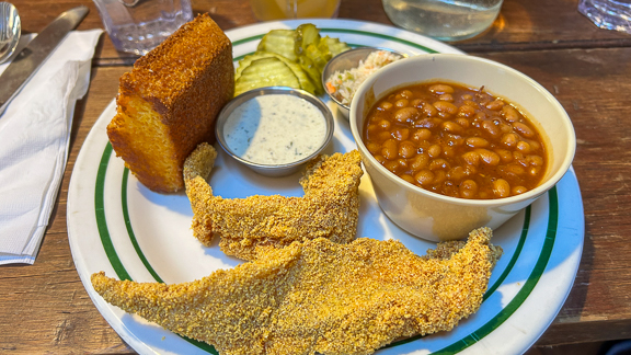 I started of course with a beer, because it felt right. For my main, I ordered the Catfish Box, which came with cornbread, pickles, and baked beans with burnt ends. The catfish was crispy and well-seasoned, though it came out very hot. The tartar sauce helped balance everything nicely.