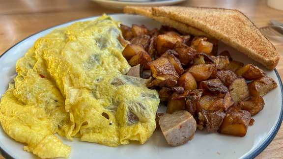 - Sausage and Pepper Omelet, breakfast sausage, sauteed onions and peppers, with breakfast potatoes, whole wheat toast and butter.