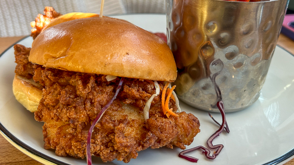 - Crispy Chicken Sandwich, buttermilk fried chicken, shredded cabbage, pickles and chipotle mayo on a brioche bun.